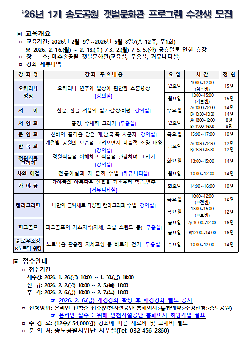 2026년 1기 송도공원 갯벌문화관 프로그램 수강생 모집