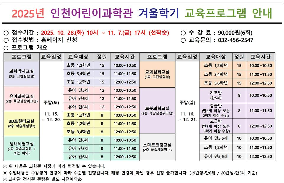 겨울학기 교육프로그램은 다음 달 15일(토)부터 12월 21일(일)까지 운영되며 만 5세부터 초등 6학년을 대상 나이별 맞춤 프로그램 7종으로 구성되어, 프로그램마다 총 6회 수업으로 진행된다.
