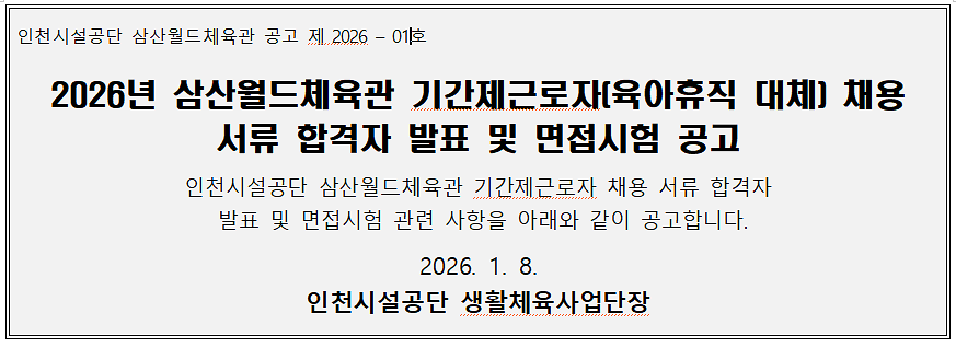 2026년 삼산월드체육관 기간제근로자 채용 서류 합격자 발표 및 면접 시험 공고