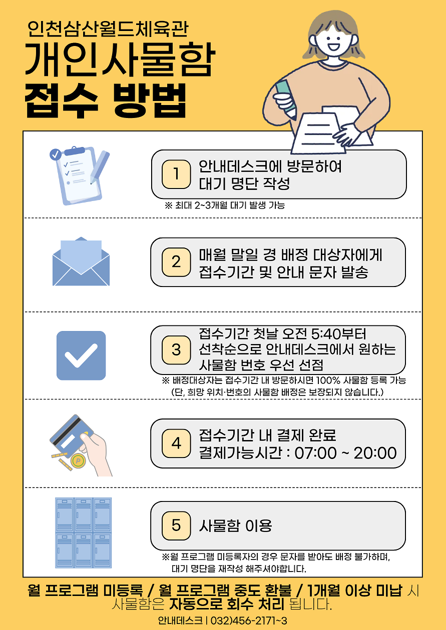3. 접수기간 첫날 오전 5:40부터 선착순으로 안내데스크에서 원하는 사물함 번호 우선 선점
