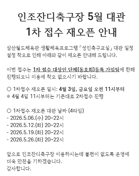 인조잔디축구장 5월 대관 1차 접수 재오픈 안내