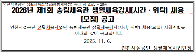 2026년 제1회 송림체육관 생활체육강사(시간,위탁) 채용(모집) 공고