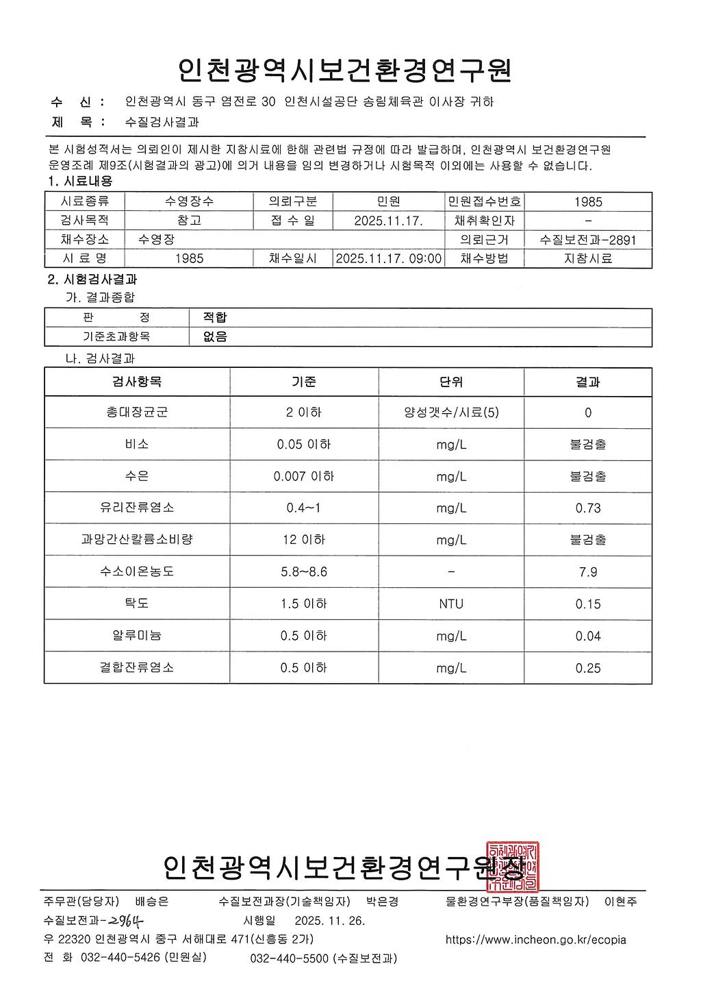 2025년 11월 송림체육관 수영장 수질검사 결과