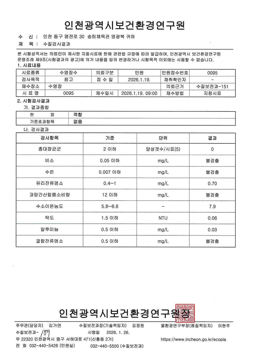 2026년 1월 송림체육관 수영장 수질검사 결과