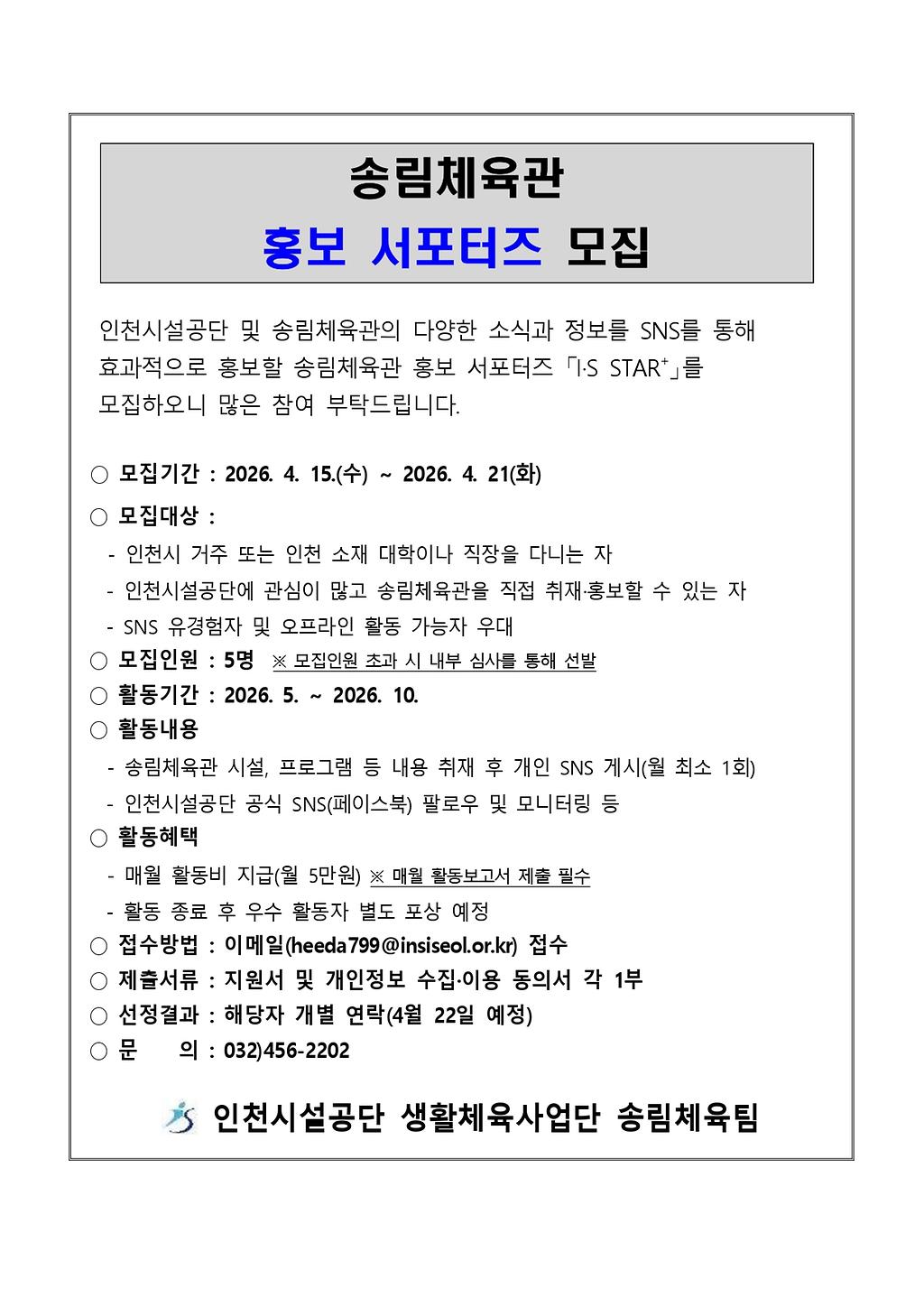 2026년 송림체육관 홍보 서포터즈 I.S STAR+ 모집